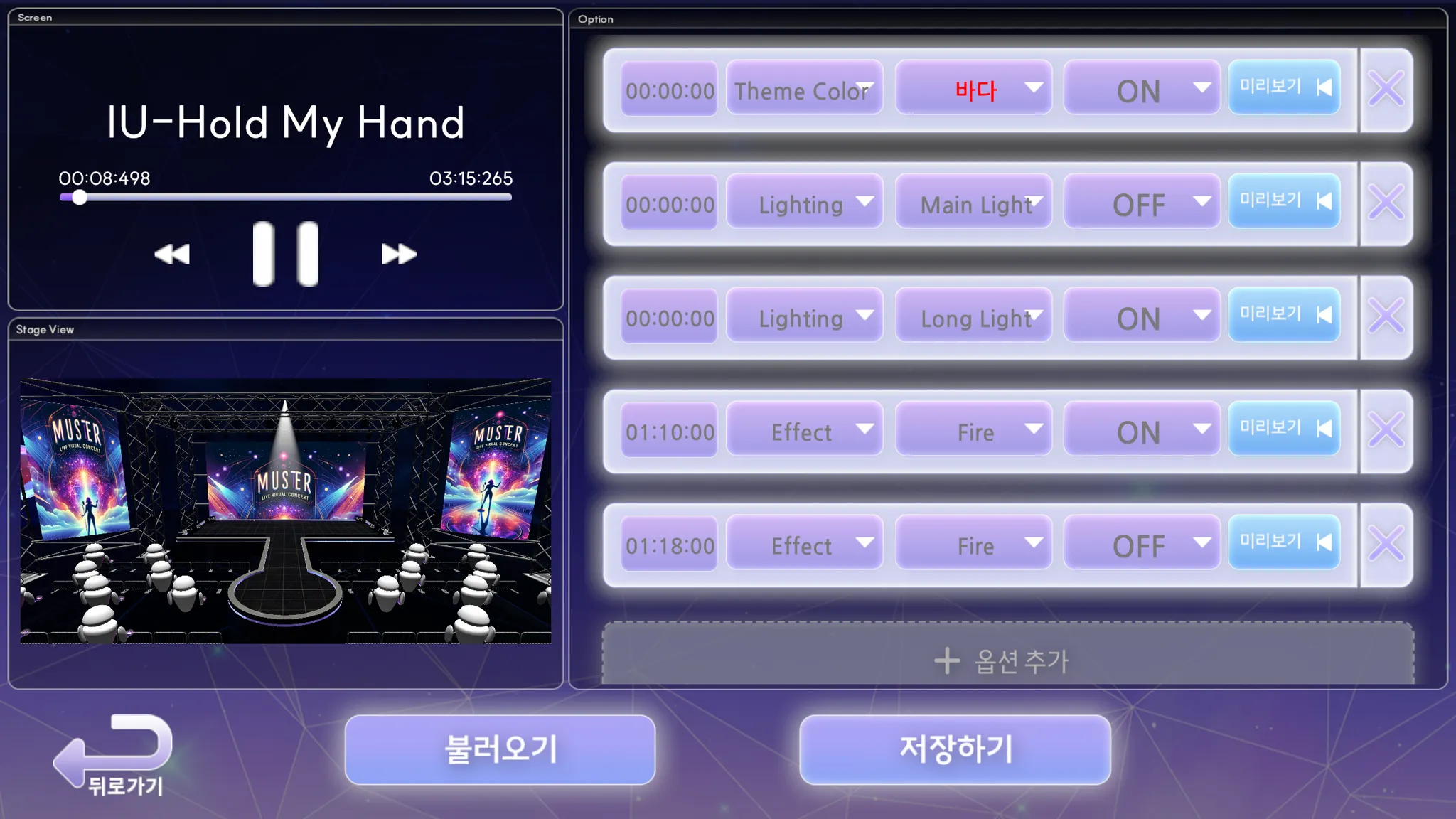 콘서트장과 조명, 특수 효과를 공연 시간에 따라 프리셋으로 쉽게 기획 및 구성이 가능한 '스테이지 시퀀서'를 제공하고, 기존 스트리밍 플랫폼(숲, 치지직, 유튜브 등)과의 연동을 지원합니다.
